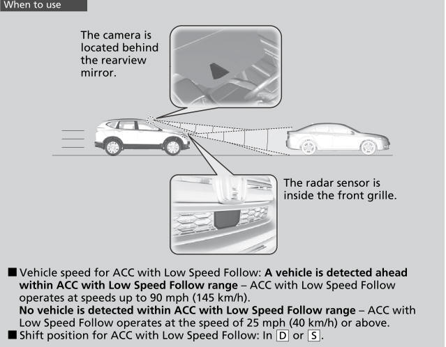 Use ACC with Low Speed Follow only when driving on expressways or freeways and in good weather conditions.
