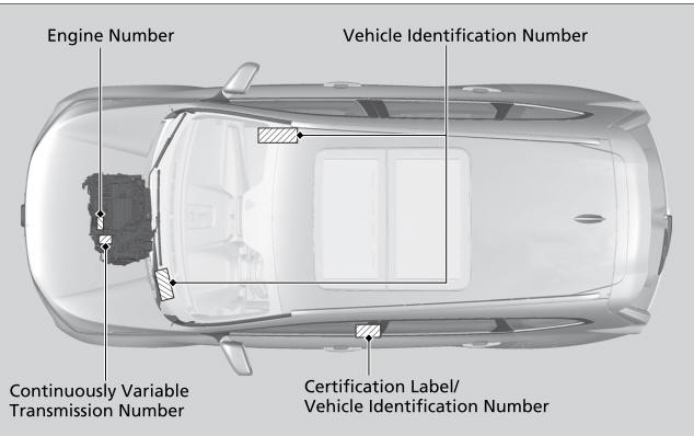 Your vehicle has a 17-digit vehicle identification number (VIN) used to register your vehicle for warranty purposes, and for licensing and insuring your vehicle. The locations of your vehicle’s VIN, engine number, and transmission number are shown as follows: